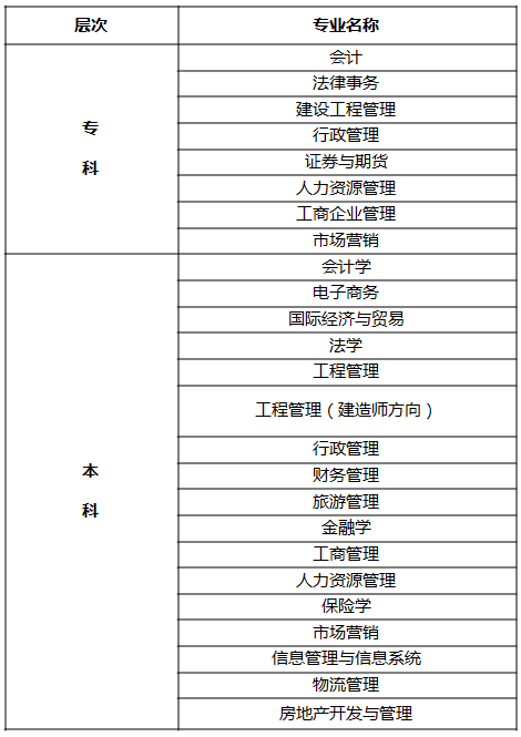 备注:工程管理(建造师方向)专业暂不开设高中起点本科及本科二学历;房地产开发与管理专业暂不开设本科二学历。